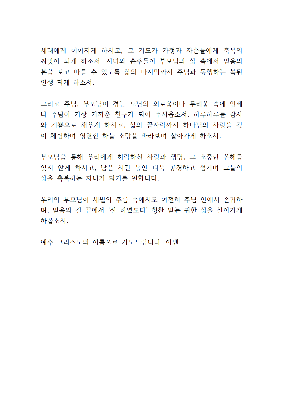 부모님께는 자녀를 하나님의 뜻대로 양육할 수 있는 지혜와 인내를 주시고, 자녀들에게는 부모님의 사랑을 이해하고 순종함으로 기쁨을 드릴 수 있는 마음을 허락하여 주소서. 세대 간의 단절이 아니라 이해와 공감으로 연결되게 하시며, 대화와 기도로 서로를 격려하고 붙들어주는 가정이 되게 하소서.