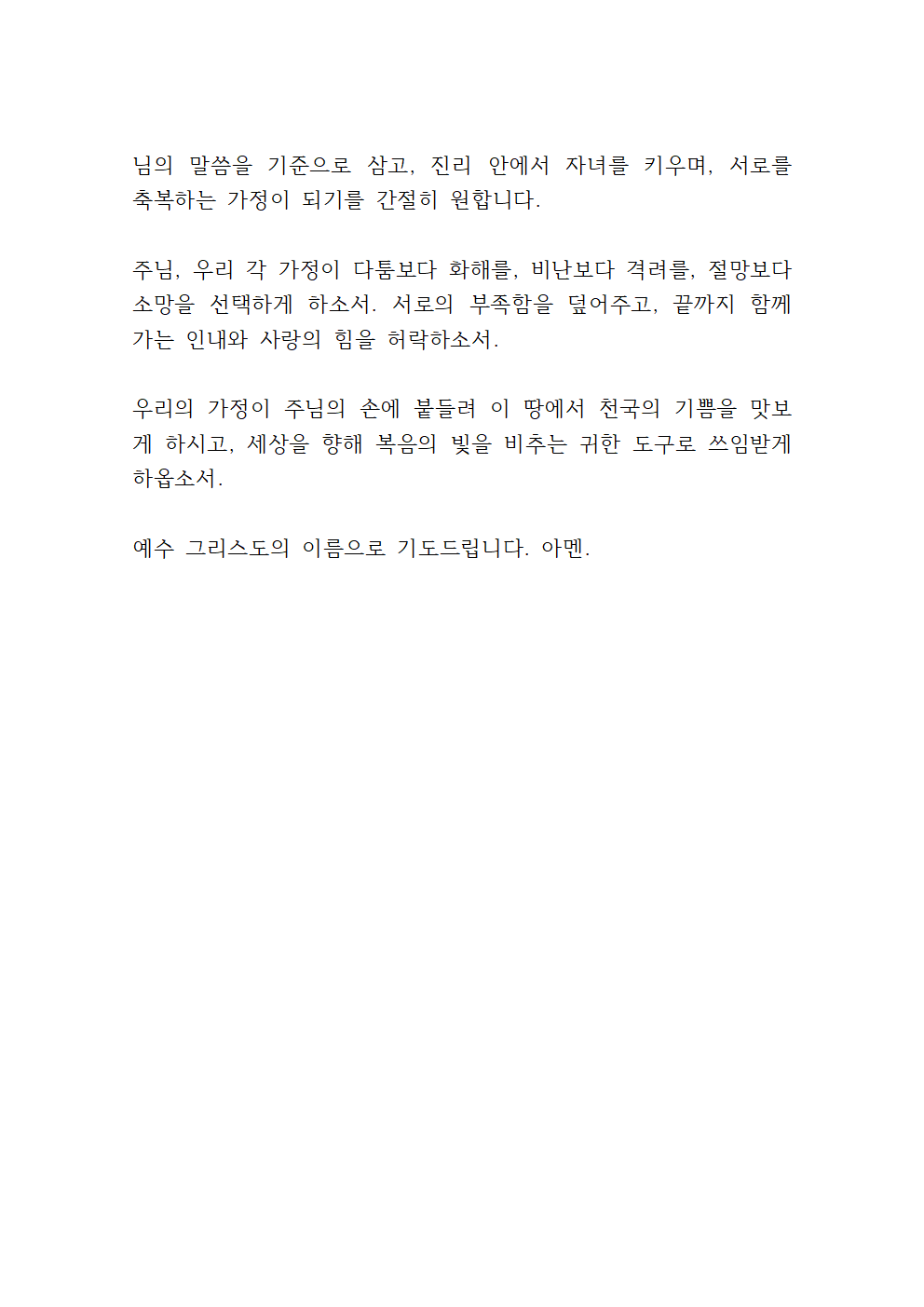 주님, 우리 각 가정이 다툼보다 화해를, 비난보다 격려를, 절망보다 소망을 선택하게 하소서. 서로의 부족함을 덮어주고, 끝까지 함께 가는 인내와 사랑의 힘을 허락하소서.