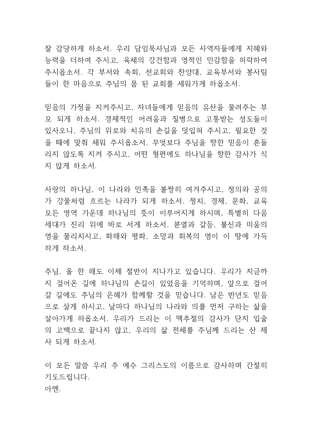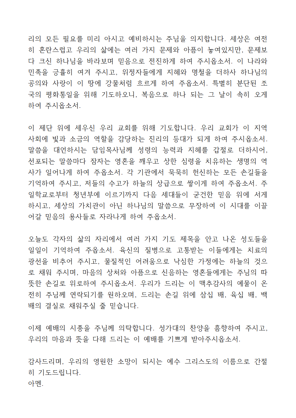감사드리며, 우리의 영원한 소망이 되시는 예수 그리스도의 이름으로 간절히 기도드립니다.