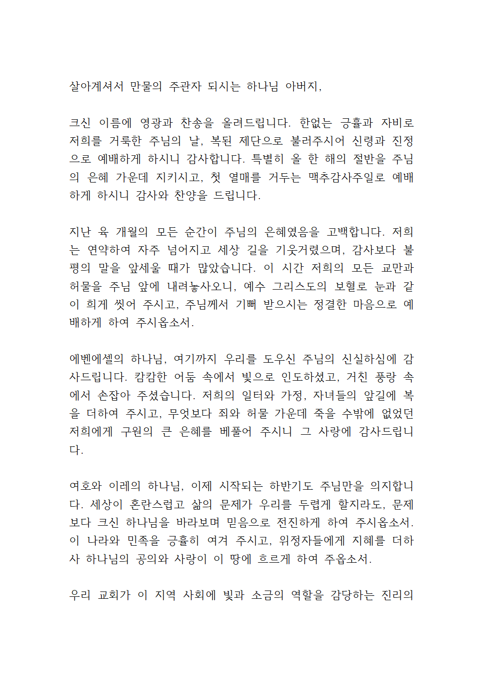 맥추감사주일 대표기도문 3