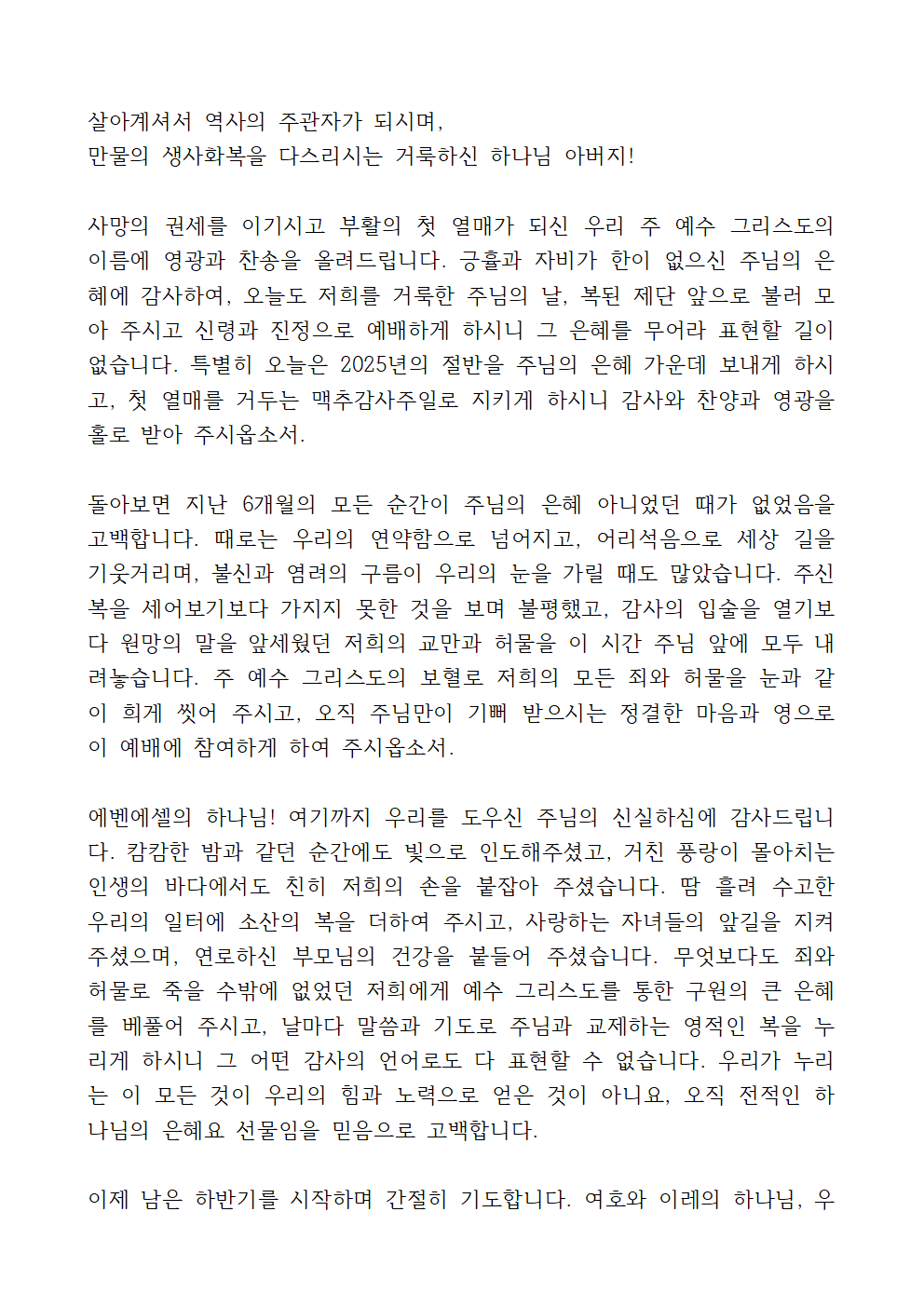 돌아보면 지난 6개월의 모든 순간이 주님의 은혜 아니었던 때가 없었음을 고백합니다. 때로는 우리의 연약함으로 넘어지고, 어리석음으로 세상 길을 기웃거리며, 불신과 염려의 구름이 우리의 눈을 가릴 때도 많았습니다. 주신 복을 세어보기보다 가지지 못한 것을 보며 불평했고, 감사의 입술을 열기보다 원망의 말을 앞세웠던 저희의 교만과 허물을 이 시간 주님 앞에 모두 내려놓습니다. 주 예수 그리스도의 보혈로 저희의 모든 죄와 허물을 눈과 같이 희게 씻어 주시고, 오직 주님만이 기뻐 받으시는 정결한 마음과 영으로 이 예배에 참여하게 하여 주시옵소서.