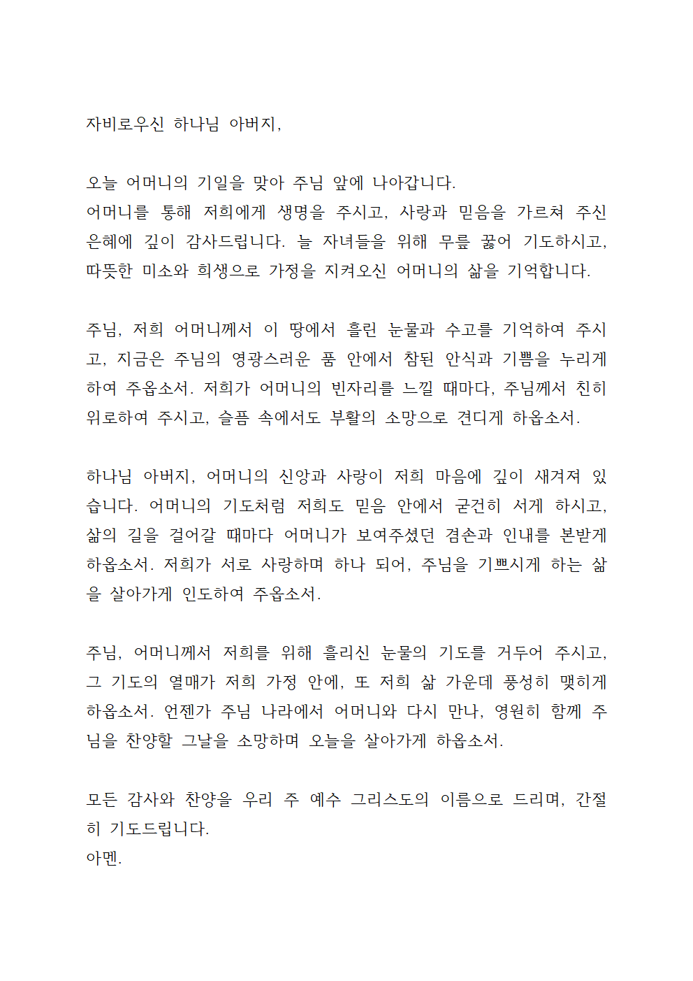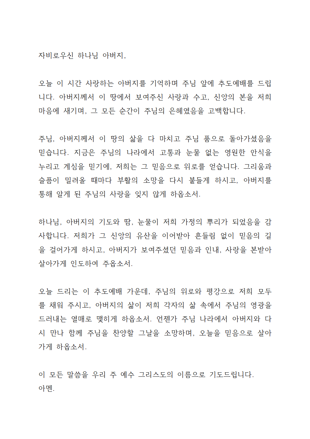 오늘 드리는 이 추도예배를 통해, 저희가 다시 한번 영원한 생명의 소망을 붙들게 하시고, 남은 삶도 주님만 바라보며 감사와 찬양으로 살아가게 하옵소서.