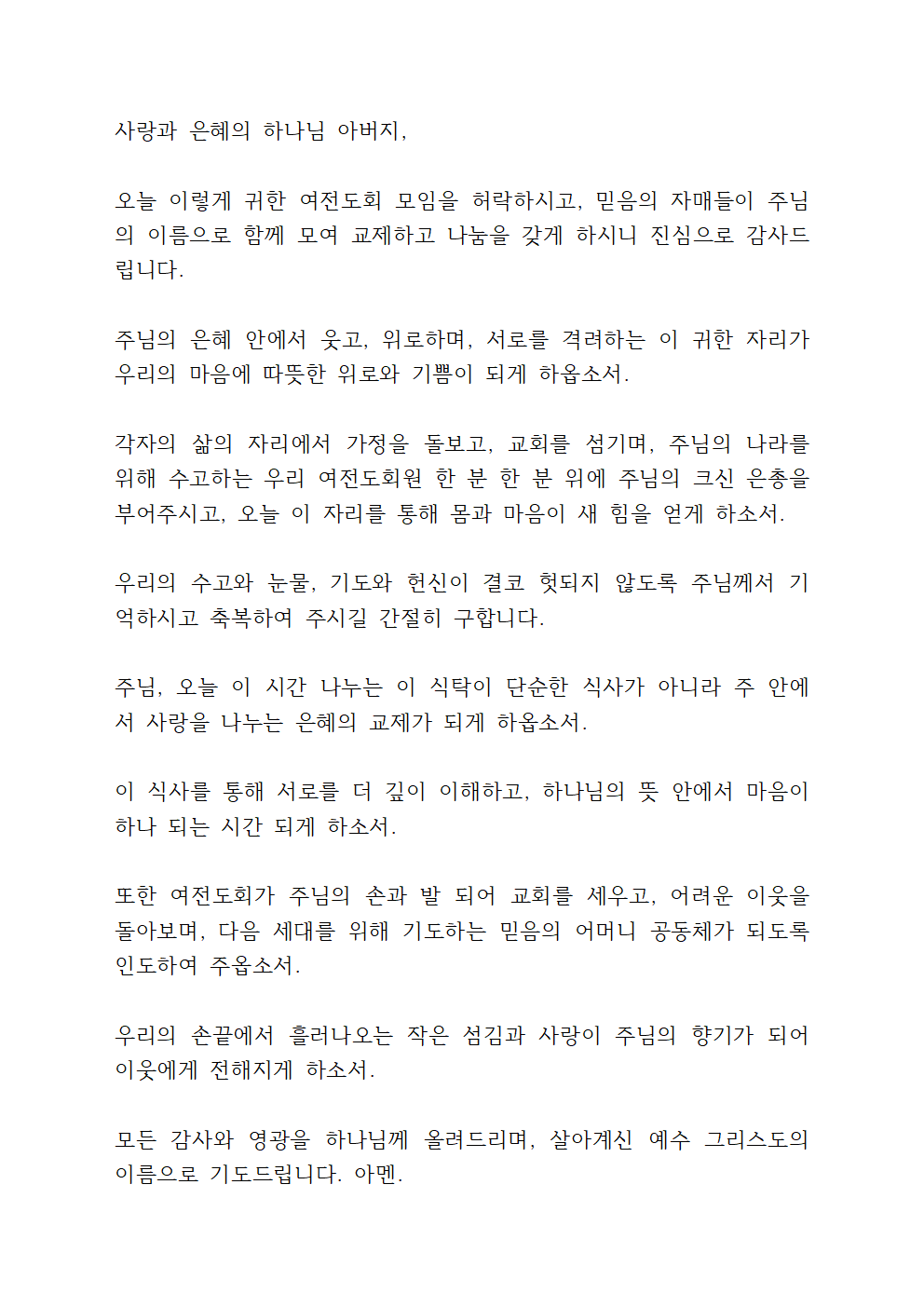 오늘 이렇게 귀한 여전도회 모임을 허락하시고, 믿음의 자매들이 주님의 이름으로 함께 모여 교제하고 나눔을 갖게 하시니 진심으로 감사드립니다.