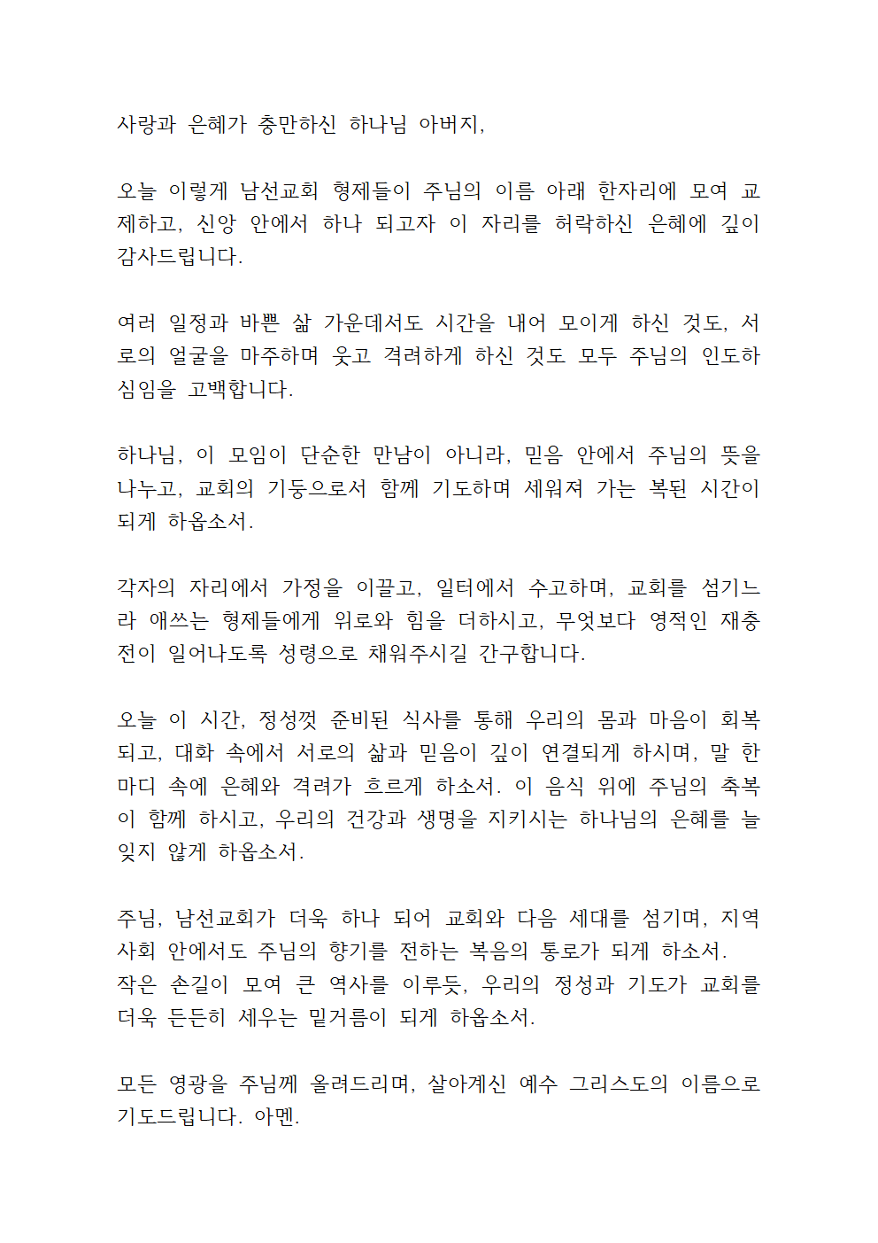 주님, 지금 우리가 함께 나누는 이 식탁은 단순한 음식의 자리가 아니라, 그리스도 안에서 하나 되는 은혜의 시작이 되게 하옵소서.
