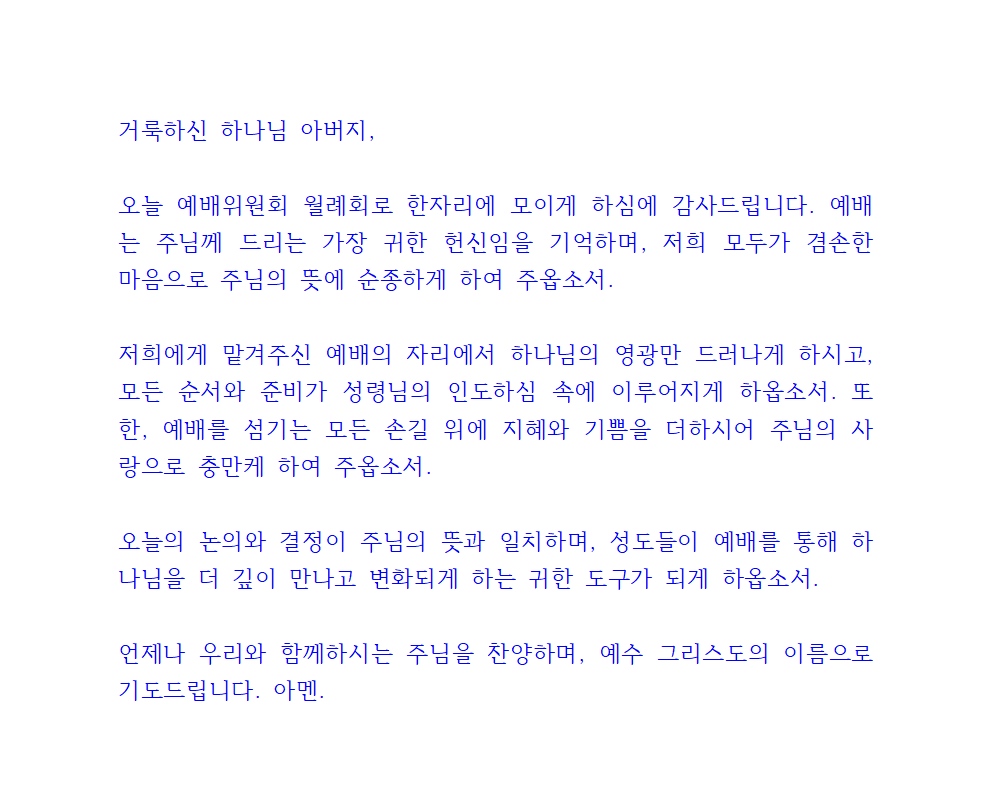 오늘의 논의와 결정이 주님의 뜻과 일치하며, 성도들이 예배를 통해 하나님을 더 깊이 만나고 변화되게 하는 귀한 도구가 되게 하옵소서. 언제나 우리와 함께하시는 주님을 찬양하며, 예수 그리스도의 이름으로 기도드립니다. 아멘.