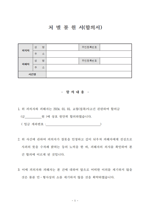 이 문서는 형사 사건에서 중요한 역할을 하며, 피해자가 처벌을 원하지 않는다는 점을 법원에 전달하는 데 사용됩니다.