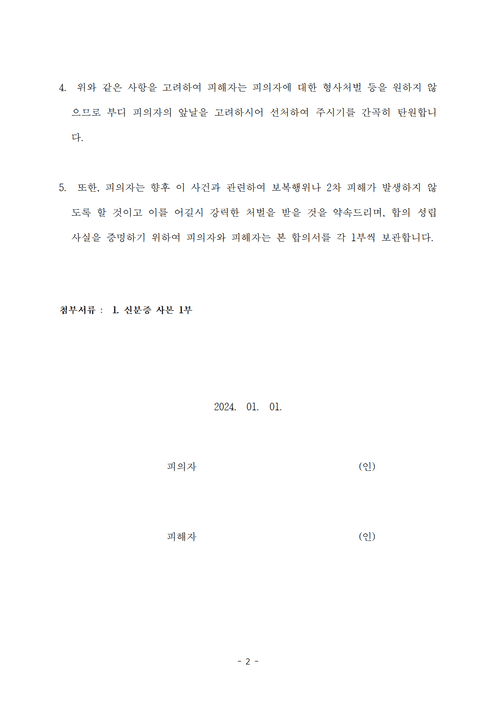 ④ 날짜 및 서명: 문서의 효력을 위해 피해자의 서명과 날짜는 필수적입니다. 이는 피해자의 진정한 의사임을 나타냅니다.