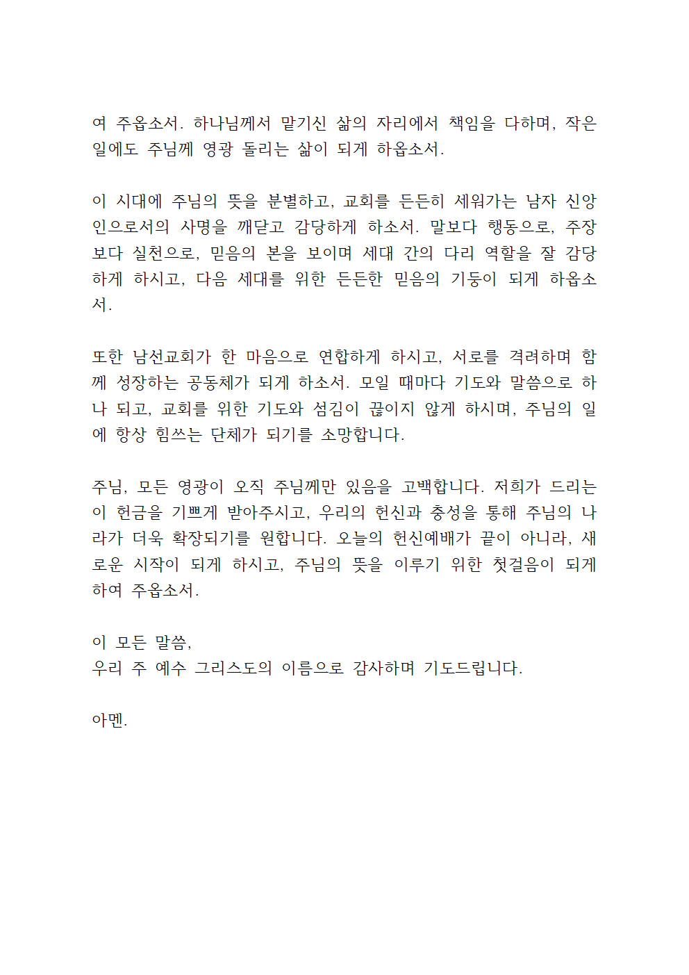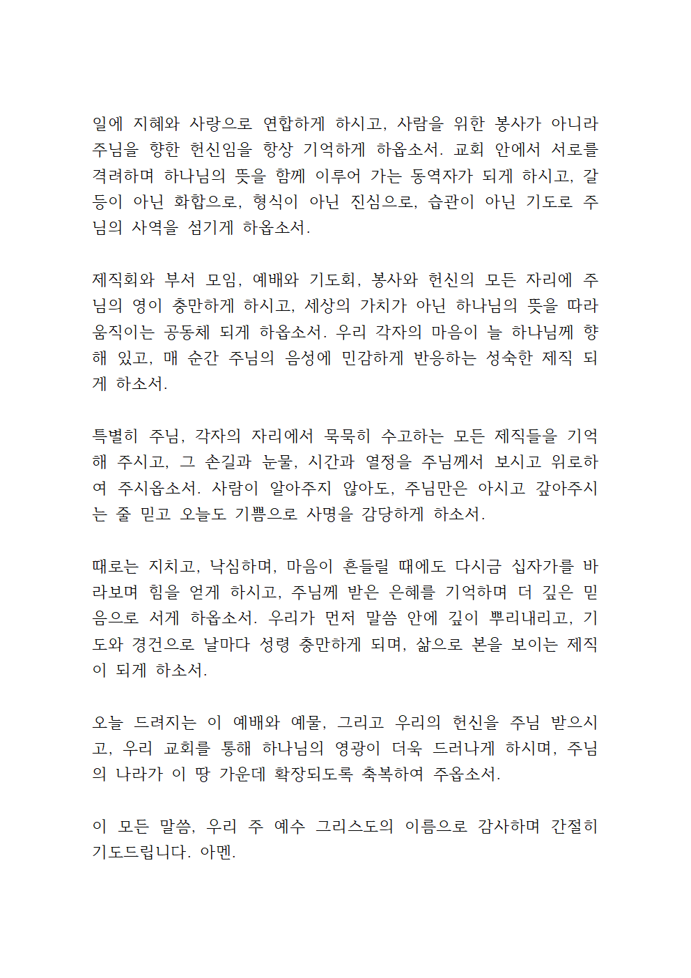 주님, 오늘 드려지는 이 헌금과 헌신예배가 하늘의 기쁨이 되기를 소망합니다. 모든 영광을 오직 주님께 올려드리며, 우리의 삶 전체가 주님의 찬양이 되기를 기도합니다.