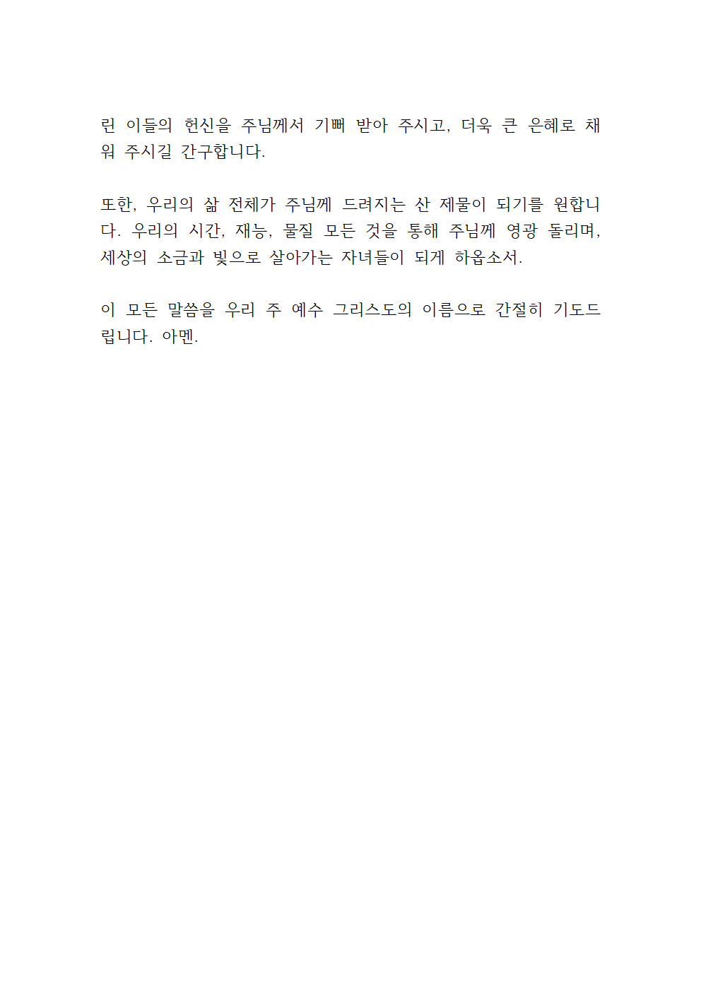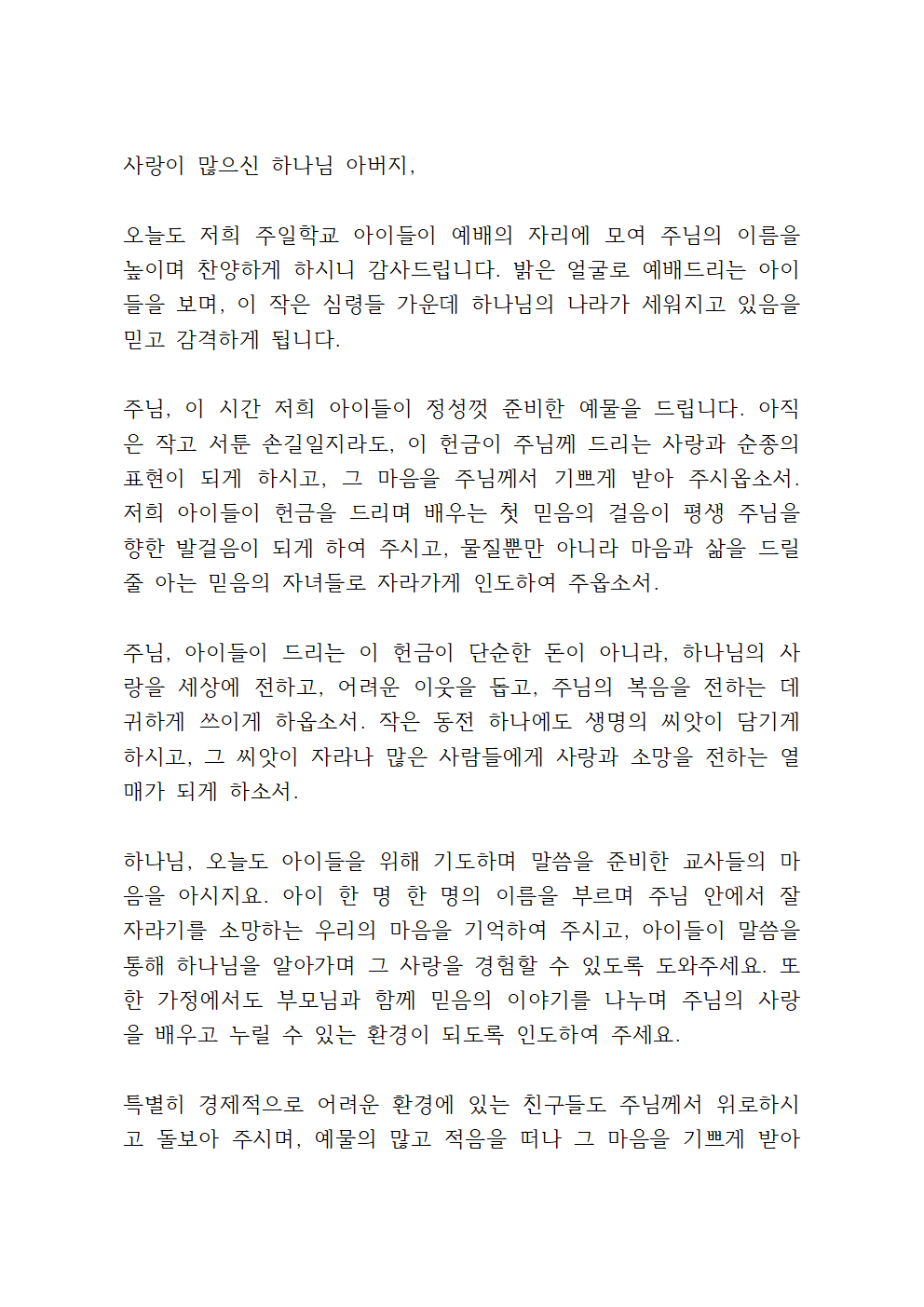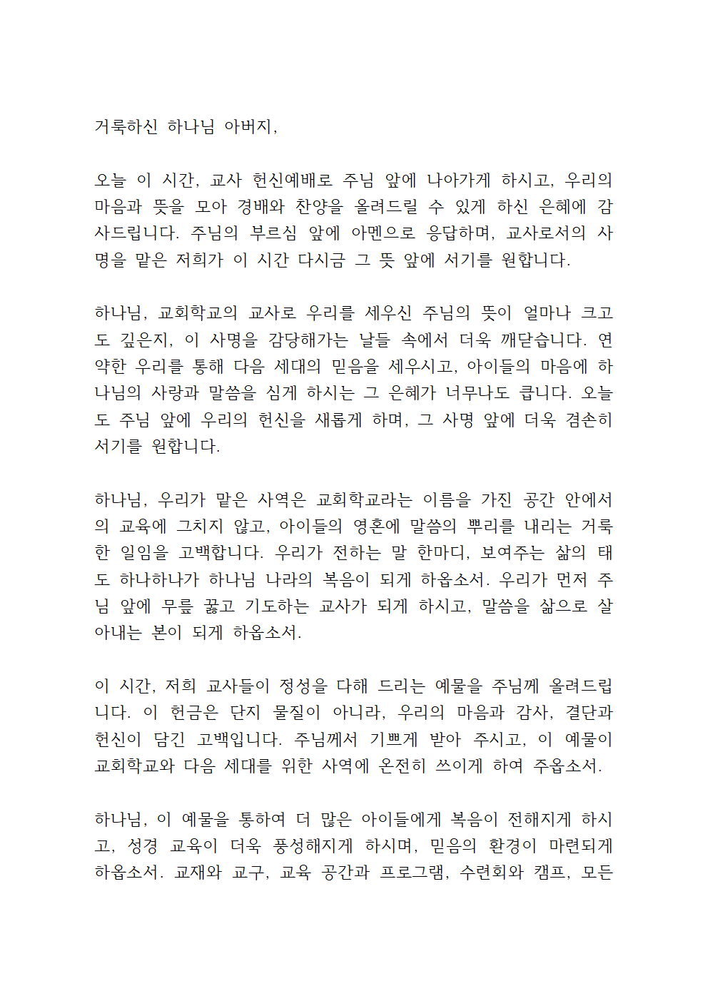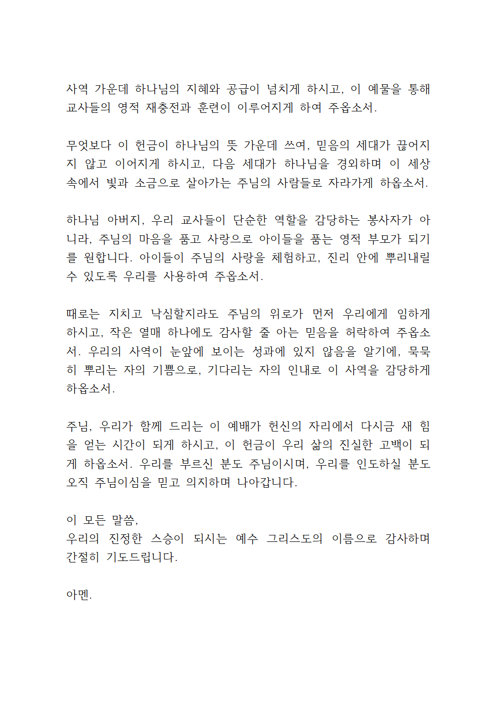 주님께서 허락하신 것 가운데 일부를 다시 주님께 올려드리오니, 이 예물이 교회의 모든 사역에 선하게 사용되게 하시고, 찬양사역과 예배의 자리에 필요한 모든 것들을 채우는 데 쓰이게 하여 주옵소서. 교회의 다음 세대 찬양 인재를 양성하고, 예배의 기초를 튼튼히 세우는 일에 쓰임받게 하소서.