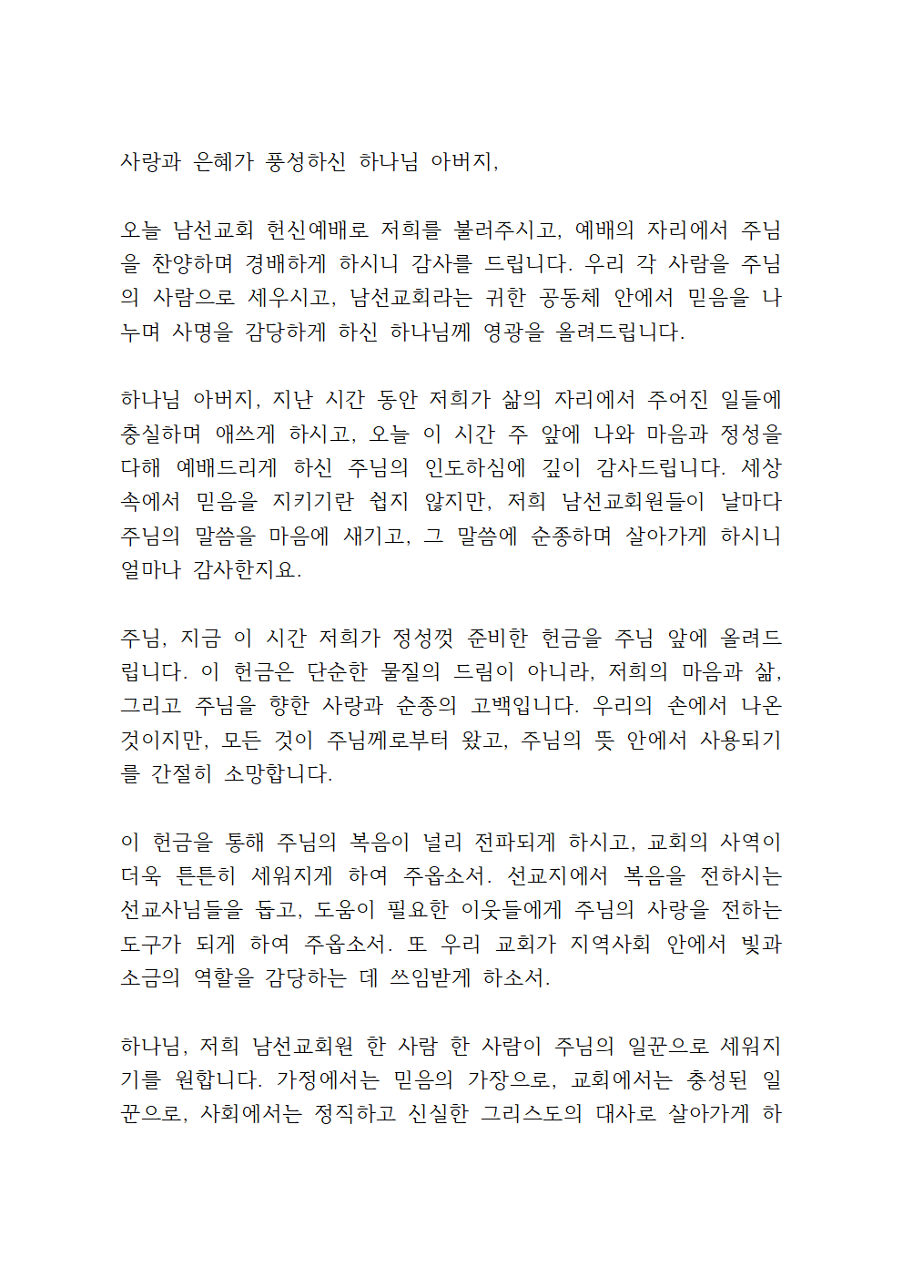 남선교회 헌신예배 헌금 기도문
