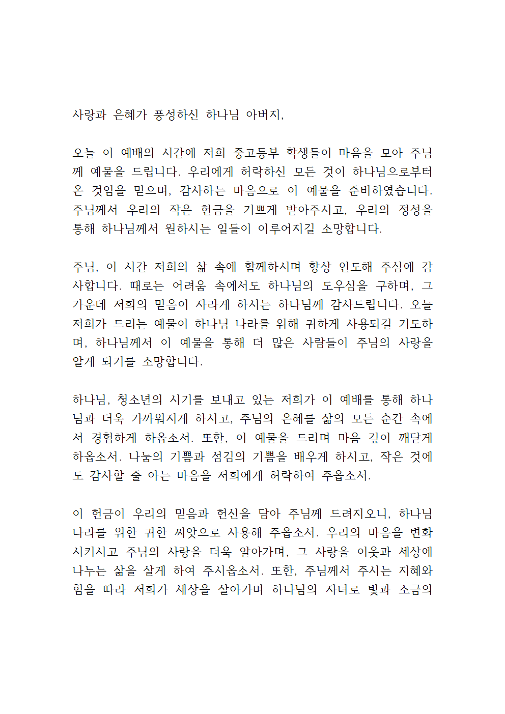 중고등부예배 헌금 기도문
