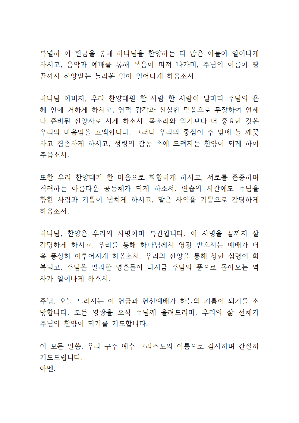 또한 우리 찬양대가 한 마음으로 화합하게 하시고, 서로를 존중하며 격려하는 아름다운 공동체가 되게 하소서. 연습의 시간에도 주님을 향한 사랑과 기쁨이 넘치게 하시고, 맡은 사역을 기쁨으로 감당하게 하옵소서.
