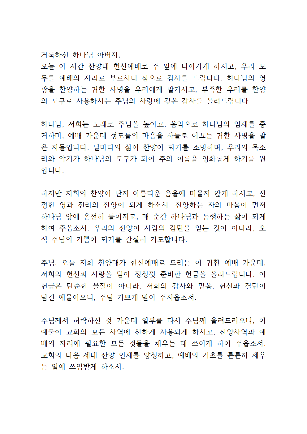 하나님 아버지, 우리 찬양대원 한 사람 한 사람이 날마다 주님의 은혜 안에 거하게 하시고, 영적 감각과 신실한 믿음으로 무장하여 언제나 준비된 찬양자로 서게 하소서. 목소리와 악기보다 더 중요한 것은 우리의 마음임을 고백합니다. 그러니 우리의 중심이 주 앞에 늘 깨끗하고 겸손하게 하시고, 성령의 감동 속에 드려지는 찬양이 되게 하여 주옵소서.