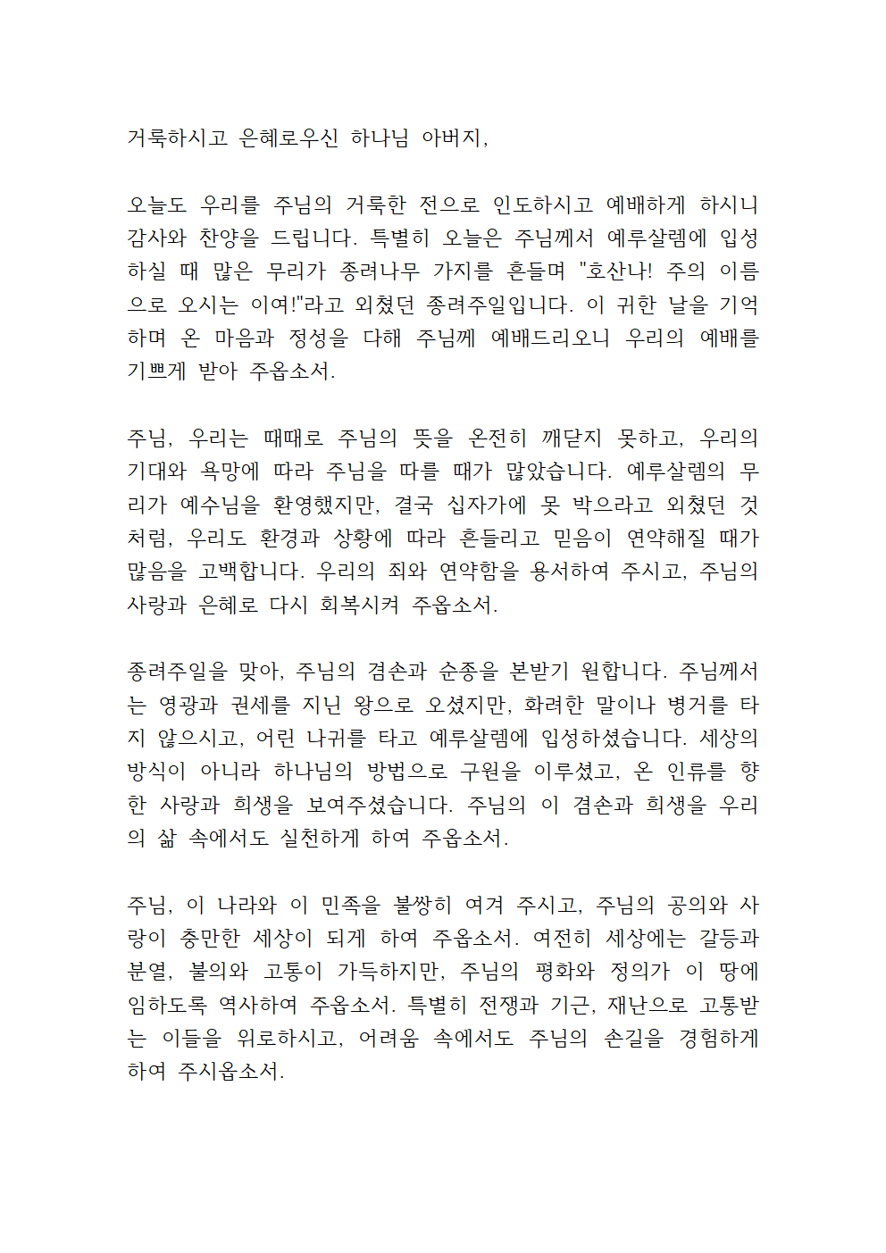 종려주일을 맞아, 주님의 겸손과 순종을 본받기 원합니다. 주님께서는 영광과 권세를 지닌 왕으로 오셨지만, 화려한 말이나 병거를 타지 않으시고, 어린 나귀를 타고 예루살렘에 입성하셨습니다. 세상의 방식이 아니라 하나님의 방법으로 구원을 이루셨고, 온 인류를 향한 사랑과 희생을 보여주셨습니다. 주님의 이 겸손과 희생을 우리의 삶 속에서도 실천하게 하여 주옵소서.