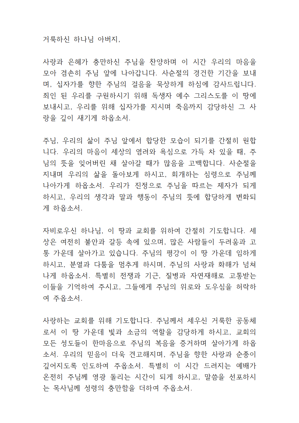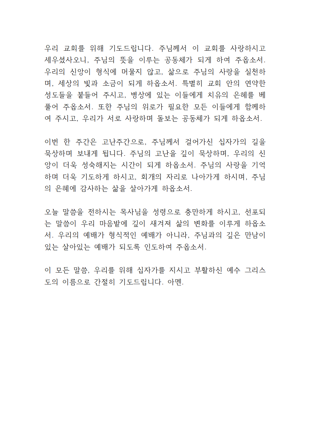 이 모든 말씀, 우리를 위해 십자가를 지시고 부활하신 예수 그리스도의 이름으로 간절히 기도드립니다. 아멘.