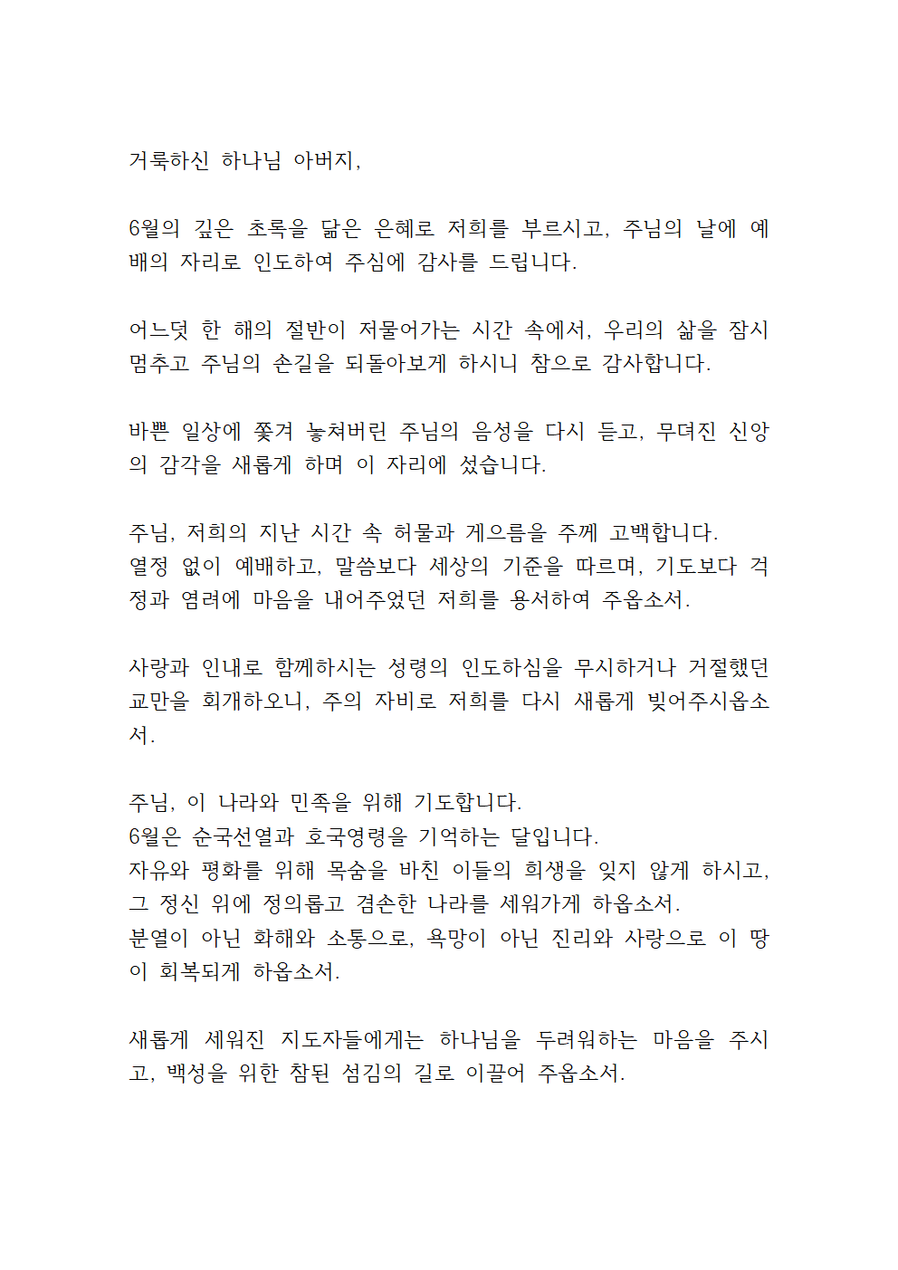 이번 글에서는 6월 넷째주 대표기도문을 안내해 드리겠습니다.