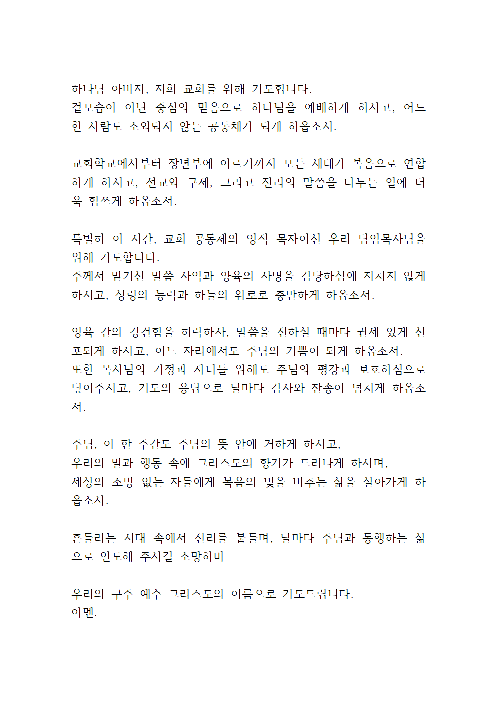 영육 간의 강건함을 허락하사, 말씀을 전하실 때마다 권세 있게 선포되게 하시고, 어느 자리에서도 주님의 기쁨이 되게 하옵소서. 또한 목사님의 가정과 자녀들 위해도 주님의 평강과 보호하심으로 덮어주시고, 기도의 응답으로 날마다 감사와 찬송이 넘치게 하옵소서.