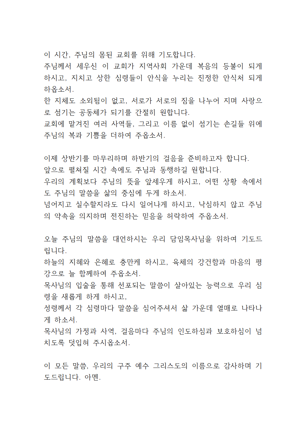 이제 상반기를 마무리하며 하반기의 걸음을 준비하고자 합니다. 앞으로 펼쳐질 시간 속에도 주님과 동행하길 원합니다. 우리의 계획보다 주님의 뜻을 앞세우게 하시고, 어떤 상황 속에서도 주님의 말씀을 삶의 중심에 두게 하소서. 넘어지고 실수할지라도 다시 일어나게 하시고, 낙심하지 않고 주님의 약속을 의지하며 전진하는 믿음을 허락하여 주옵소서.