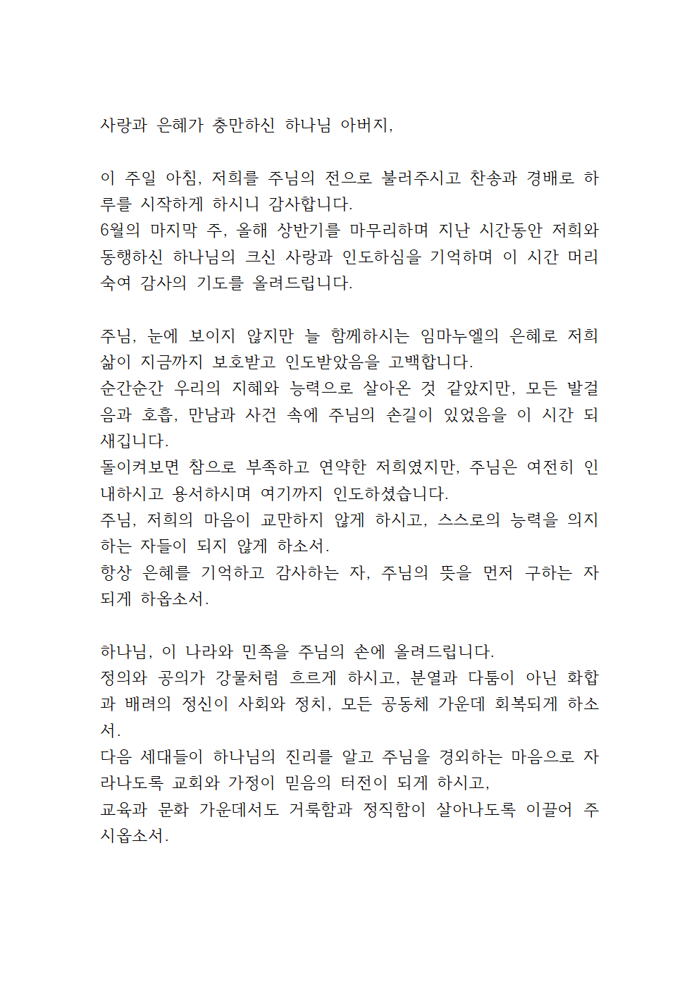 이 주일 아침, 저희를 주님의 전으로 불러주시고 찬송과 경배로 하루를 시작하게 하시니 감사합니다. 6월의 마지막 주, 올해 상반기를 마무리하며 지난 시간 동안 저희와 동행하신 하나님의 크신 사랑과 인도하심을 기억하며 이 시간 머리 숙여 감사의 기도를 올려드립니다.