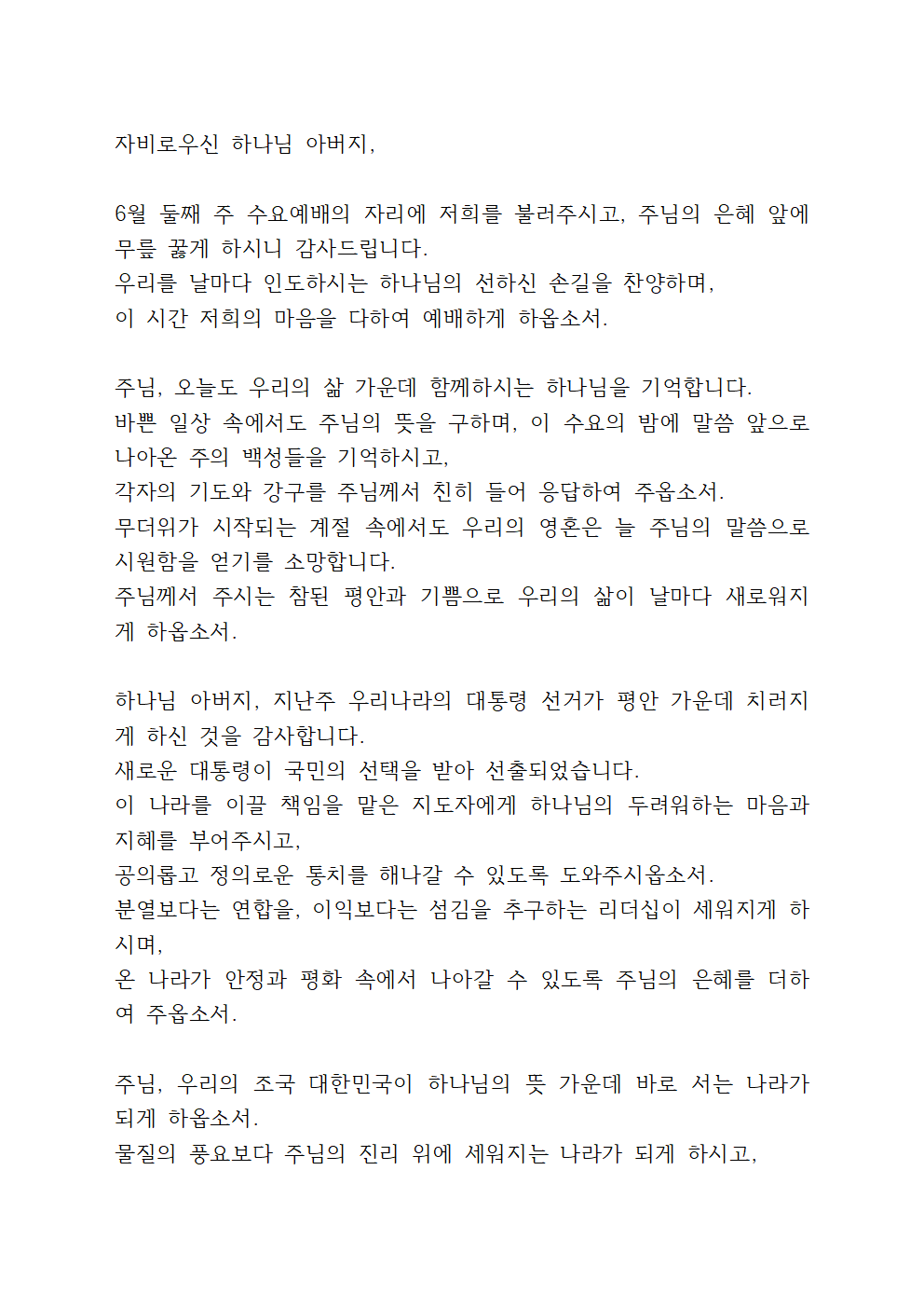6월 둘째 주 수요예배 기도문