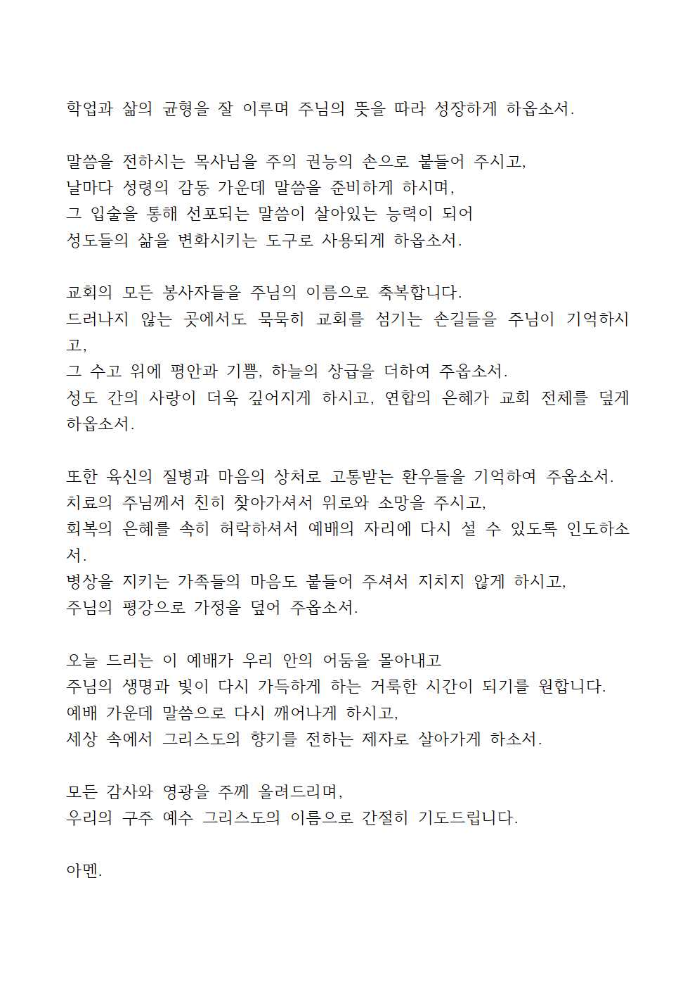 그리고 교회 곳곳에서 헌신하는 봉사자들을 축복해 주옵소서. 눈에 띄지 않아도 묵묵히 감당하는 그 섬김이 하늘에서는 귀히 여김을 받고 있음을 알게 하시고, 섬김 속에서 기쁨과 감사가 흘러나게 하소서.