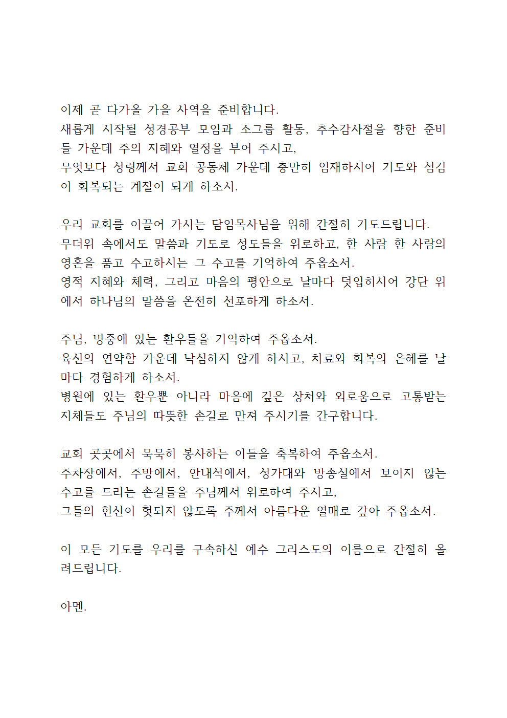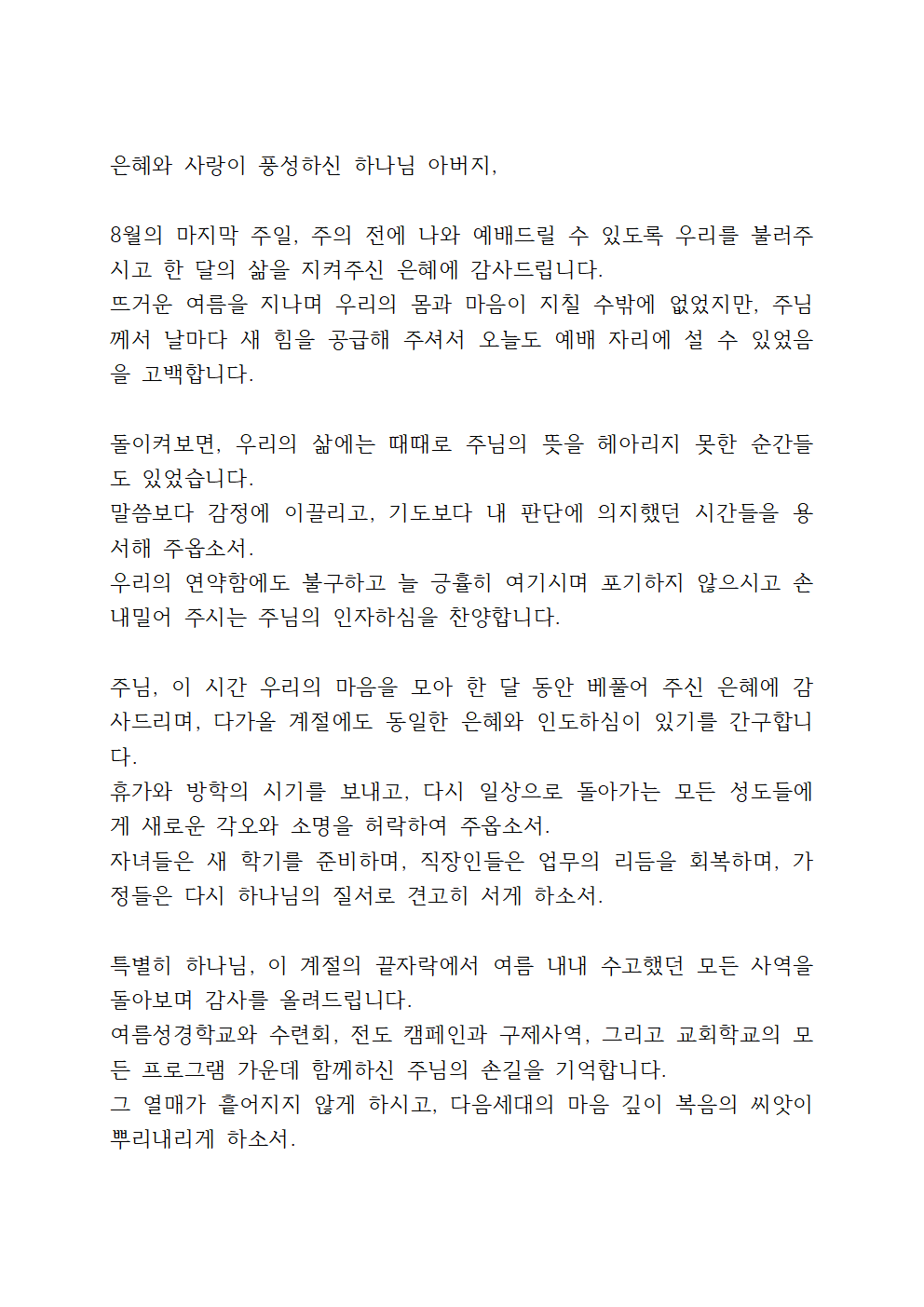 오늘 글에서는 8월 다섯째 주일낮예배 대표기도문을 안내해 드리겠습니다.