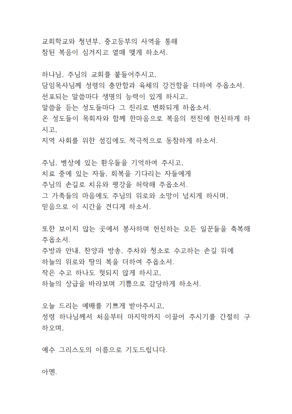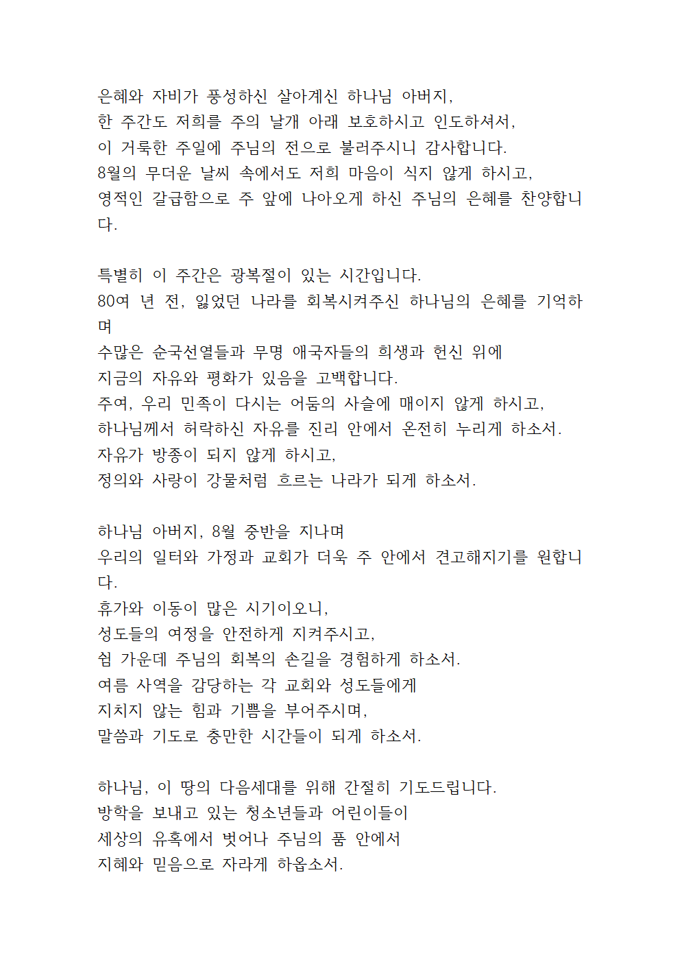 '8월 둘째 주일낮예배 대표기도문'
