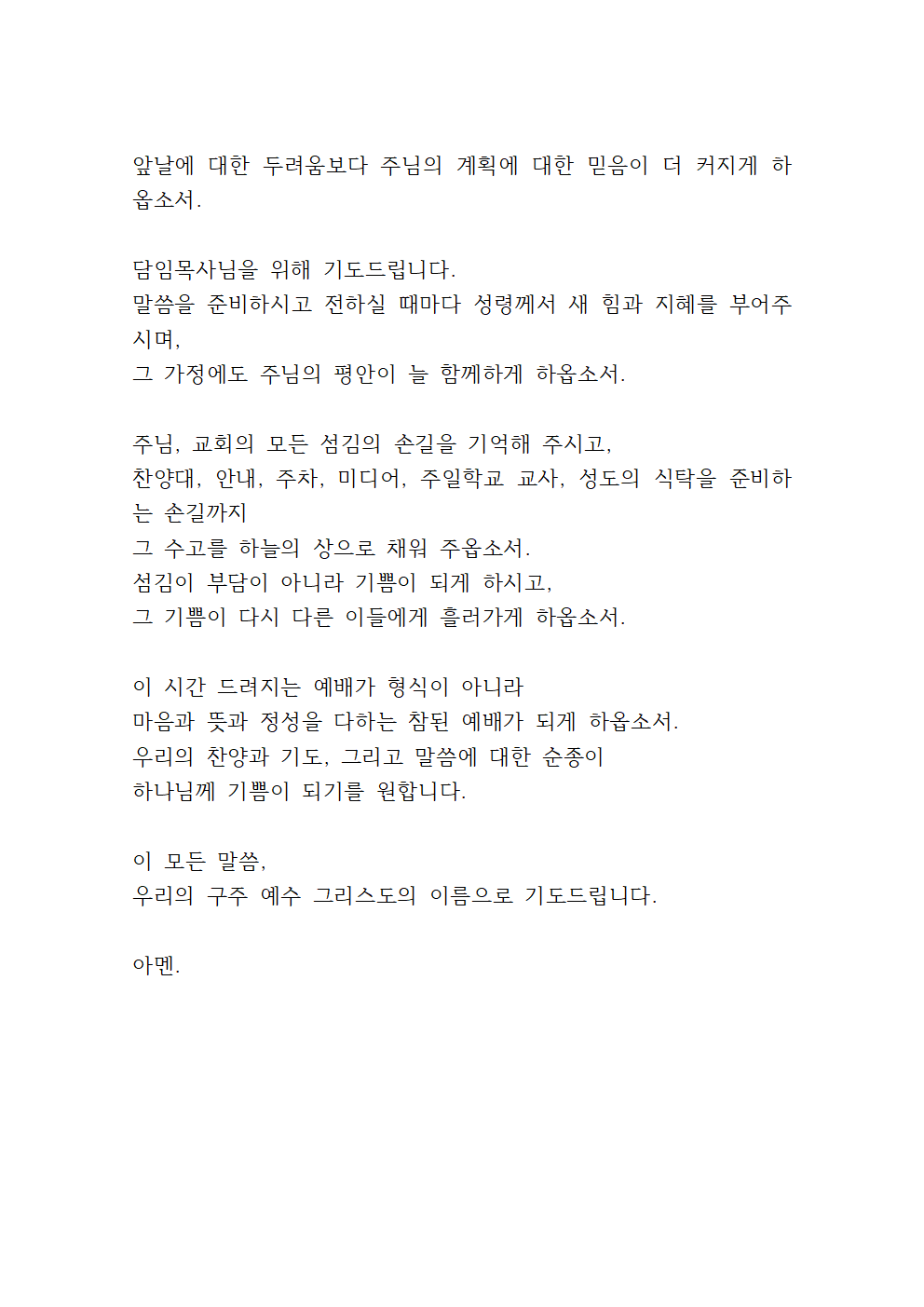 예배를 통해 받은 은혜가 한 주간의 삶 속에서 실천되게 하시며, 우리의 가정과 일터, 학업의 자리마다 주님의 다스림이 나타나게 하옵소서.