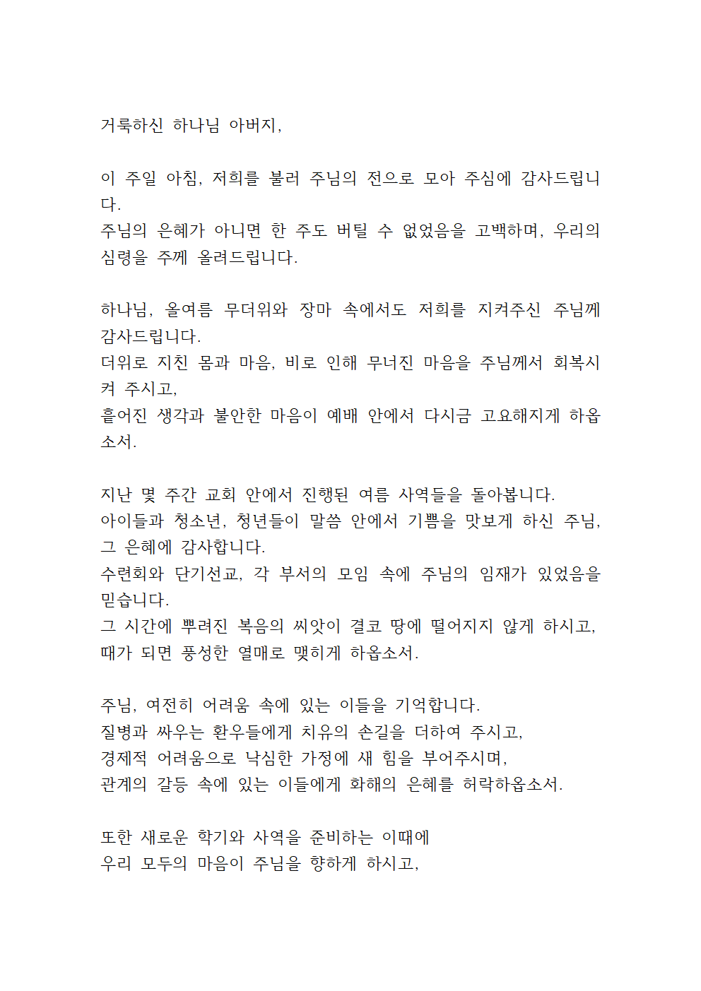 무더운 여름 가운데서도 저희를 지켜 주시고, 오늘 거룩한 주일 예배의 자리로 불러 주셔서 감사드립니다.