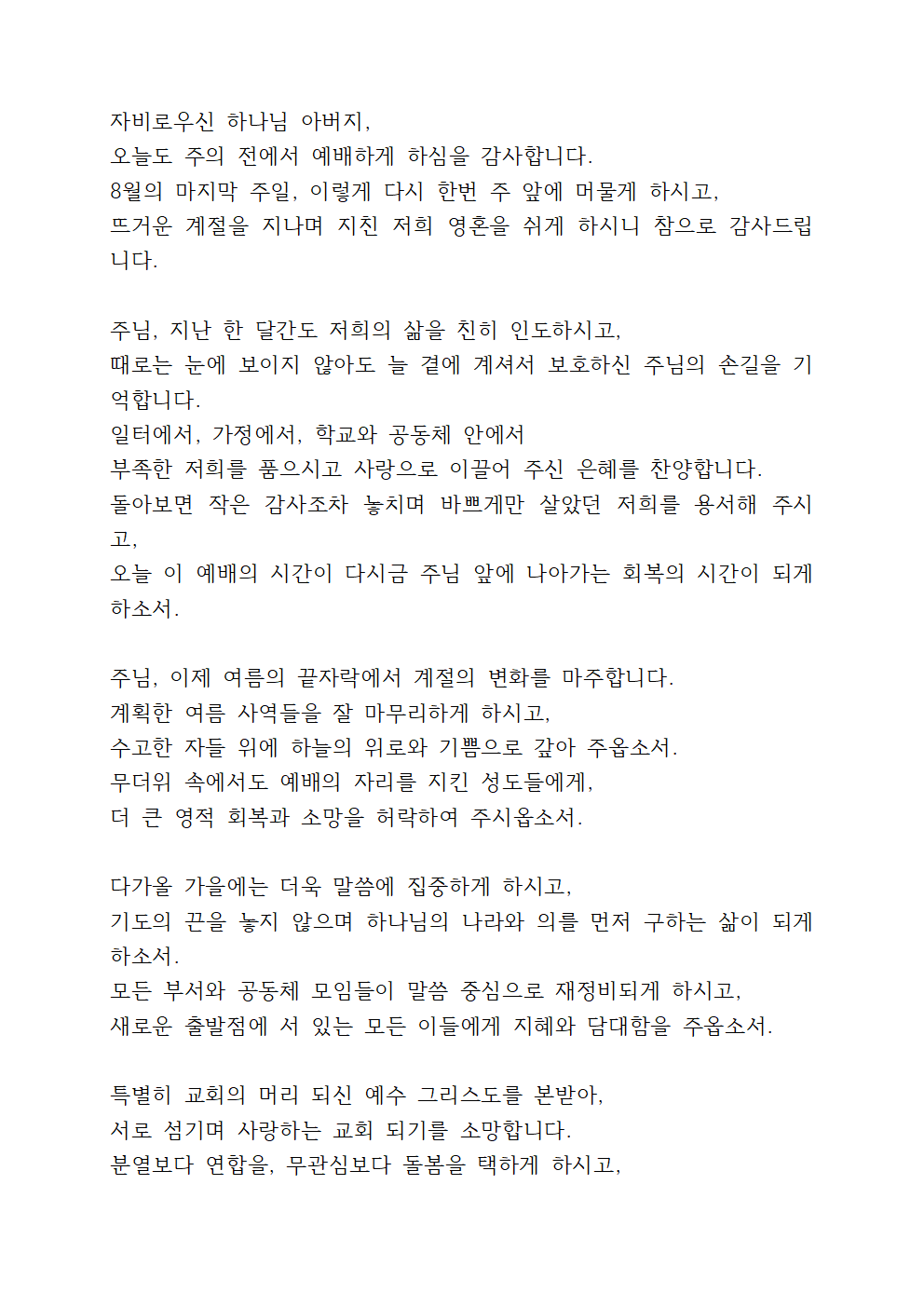 이번 글에서는 8월 5주 대표기도문을 안내해 드리겠습니다.